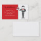 This business card features an elegant waiter in a tuxedo serving a tray of drinks on a white background. The text area of the card is red. A perfect card for a catering business or one that provides wait staff for special events.