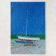 A painting of a single sailboat in a boat yard on a late spring day with a deep blue sky in the background. The artwork is about waiting for summer to start in New England and the fun on the water that comes with living in a coastal town.