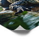 A large crocodile rests in a lush, tropical environment, partially submerged in a shallow water body surrounded by vibrant green foliage. Sunlight filters through the trees, casting dappled light on the reptile's scaly skin.