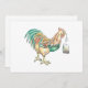 Invitation card (flat not folded) featuring a colorful hand-drawn illustration of a rooster ready to help you wake up in the morning with a hot cup of tea! Artwork: Pen and Ink on paper. Copyright Dominic A. White