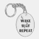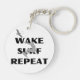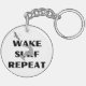 This keychain features a dynamic graphic design of a person wake surfing, with a stylized wave below and a bird flying overhead. The words “WAKE SURF REPEAT” are prominently displayed above and below the surfer in bold, capital letters. This design captures the thrill and excitement of wake surfing, making it a perfect accessory for water sports enthusiasts.