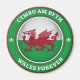 A patriotic design featuring a rounded 3D Welsh flag inset into an outer ring colored in Welsh colors. The top text is of Celtic origin and translates as Wales Forever. The bottom text is the English meaning of the top text.