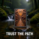 This Zippo lighter features a dramatic, highly dimensional, embossed-style illustration of a long, wooden suspension bridge disappearing into a deep, stylized gorge. The background features textured brown cliffs and dense, stylized brown trees that frame the sides. The embossed text "WALK BY FAITH" is prominently displayed above the bridge in the upper center. The rich, monochromatic color palette, texture, and shading give the entire design a Soft-Leather Look. You could easily mistake the textures for genuine leather. The design may look real due to the high detail in the artwork. The entire design is set on a matte black lighter casing.