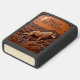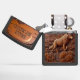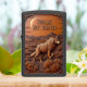 This Zippo lighter features a dramatic, highly dimensional, embossed-style illustration of a wolf walking along a path. The path cuts through dense, textured desert brush or tall grass, rendered in rich brown and orange tones. The scene is set under a large, burnished full moon and a stylized orange sky above desert mountains. The embossed text "WALK BY FAITH" is displayed prominently in the upper center. The detailed texture and coloring give the entire design a Soft-Leather Look. You could easily mistake the textures for genuine leather. The design may look real due to the high detail in the artwork. The entire design is set on a matte black lighter casing.