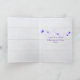 White stationery and envelope with purple flowers and ribbon on white wood background for walk me down the aisle for cousin.