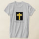 Religious quote and gold cross on woman's gray t-shirt was inspired while seeking Biblical answers to a personal issue.