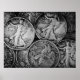 Enjoy this black and white photograph of Walking Liberty fifty-cent piece coins.