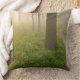 Throw pillow with a walking path through bluebells leading into a forest at sunrise on a foggy morning, creating a magical atmosphere.