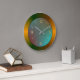 A simplistic engaging kitchen clock with reflects of gold. A round centre with aqua green and hints of red.A fine black border with black hands compliment the design. Available in round and square shapes.