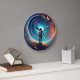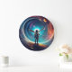 Elevate your home decor with this stunning wall clock that combines art and functionality. Featuring a captivating design of a person standing with arms outstretched, surrounded by a cosmic swirl of vibrant colors and celestial elements, this clock is a visual masterpiece. The sleek, round clock face is set against a white shiplap wall, adding a touch of modern elegance to any room. Perfectly positioned above a small table adorned with books and a potted lavender plant, this clock not only tells time but also serves as a unique piece of art that inspires wonder and imagination. Ideal for living rooms, bedrooms, or offices, this wall clock is a blend of practicality and aesthetic appeal.