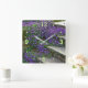 WALL CLOCK/PURPLE FLOWERS CLINGING TO STEPS/GREEN SQUARE WALL CLOCK