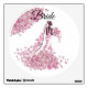 This wall decal cling can be reused and hung on almost anything. Shown in the round shape, it has a lovely coral-pink coloring with a bride image adorned in a lovely gown, and the word "Bride" at the top. Nice use for the dressing room