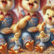 Envision a whimsical wallpaper design featuring a family of ducks and ducklings dressed in tiny, playful outfits, including jeans and colorful hats. These charming characters are scattered across a serene, natural setting, perhaps by a calm pond or a sunlit meadow. The adult ducks, with their jaunty hats and well-fitted jeans, lead the way, while the ducklings, equally stylish in their mini attire, follow closely behind, waddling happily.