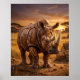 Monumental walnut rhinoceros artwork featuring a mighty rhino formed from cracked walnut shells, warm nut grain textures, polished brown surfaces, and sculpted horn details. Set in glowing harvest plains with acacia trees, golden grasses, rocky outcrops, rustic wagons, and sunset skies, this fantasy creature feels powerful and majestic. Perfect for statement walls, offices, rustic homes, dining rooms, masculine décor, or collectors of bold edible animal artwork.