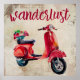 Cute poster with a whimsical painting of a red moped with a flower basket on the back. The moped has a trendy retro design. Ready for adventure. Wanderlust written in a fancy handwritten font. Inspirational typography. The background is a chic distressed looking texture with circles and random marks in a light brown color.
