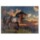On old Native American warhorse, stands on a grassy hill watching the sunset. The clouds drifting through the sky are lit with fiery red light as they catch the rays of the sun. A breeze blows causing the pinto colored mustang's black mane and tail to blow in the wind. Warpaint adorns this horse, but his rider is nowhere to be seen.