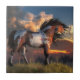 On old Native American warhorse, stands on a grassy hill watching the sunset. The clouds drifting through the sky are lit with fiery red light as they catch the rays of the sun. A breeze blows causing the pinto colored mustang's black mane and tail to blow in the wind. Warpaint adorns this horse, but his rider is nowhere to be seen.
