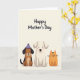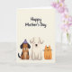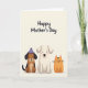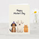 Designed with a soft, creamy background, this card features three sweet animal companions lined up across the lower third, leaning close as if sharing a quiet moment ❤️. On the left, a small brown dog with a speckled coat wears a purple knitted cap, its gentle eyes turned toward the others in an affectionate glance. In the center, a larger off-white dog with rosy cheeks and rounded features sits calmly, giving a tender, trusting look that suggests closeness. On the right, an orange cat with light forehead stripes and long whiskers nestles in, adding a cozy, friendly balance to the group 🌼. The illustration uses smooth, rounded shapes with subtle watercolor-like texture, keeping everything soft and approachable. Near the top, the words “Happy Mother’s Day” appear in a friendly flowing style, set in a darker tone that stands out clearly against the pale background. The purple cap is the main accent color, while warm browns and cheerful orange fill the animals’ coats with gentle shading.