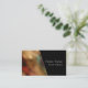Sophisticated, unique professionals in a variety of creative industries will appreciate this business card design. It is comprised of a photograph on the left, intentionally blurred, in warm tones with splashes of color. Red and blue-green peek through from the gold, blurred lighting. The blue-green hint of color is a single peacock feather under the lights with glass bottles reflecting chandelier light. On the right is a solid black overlay that cuts across the photo in a diagonal angle. White text presents your name and position. The back of the card shows your name and contact details in white on a solid black background.