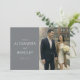 This wedding thank you card features a split design with a modern, elegant aesthetic. The left side showcases a solid gray background with clean, white sans-serif text, while the right side displays a soft-focused photograph of two individuals walking hand-in-hand in an urban setting, dressed formally and holding a bouquet. The color palette is muted, combining grays, whites, and natural tones for a sophisticated look. The overall mood is warm and celebratory, making it perfect for expressing gratitude after a special occasion.