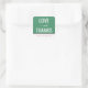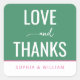 This wedding sticker features a minimalist design with a clean layout, divided into two sections by color. The upper section has a solid green background with the words "LOVE and THANKS" in bold white typography, while the lower pink strip includes customizable names in small uppercase letters. The combination of sans-serif and script fonts adds a touch of elegance, creating a warm and appreciative mood perfect for expressing gratitude at your special event.