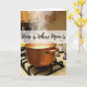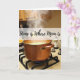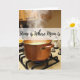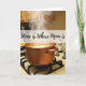 Designed with a cozy kitchen scene, the card centers on a burnished copper-toned pot resting on a creamy stovetop, like dinner is quietly on the way. A thin column of steam rises in a gentle curl, softening the light and making the wood cabinets behind it look warm and welcoming. The simmering surface glows with a golden tint, suggesting care in the small, everyday way that feels like love ❤️. Beneath the pot, a small blue flame flickers, adding a steady, attentive energy to the moment. Across the middle of the design, a flowing line of lettering stretches horizontally, set in a dark ink that stands out against the lighter background. The surrounding counter details fade slightly out of focus, like the room is giving the pot center stage while someone nearby watches with a fond, unspoken smile 🌼. The pot’s curved handles catch a soft highlight, and the steam trails upward in a pale, airy ribbon near the top edge.