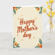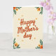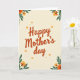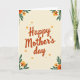 This greeting card features the words “Happy Mother’s day” centered in a flowing, calligraphy-style lettering, colored in warm terracotta with a faint shadow that gives it slight lift from the background. A soft cream backdrop fades gently toward a pale yellow near the edges, like early morning light across smooth paper. In the upper-left corner, a clustered bouquet of deep green leaves surrounds rounded orange blooms and smaller yellow-orange flowers, arranged as if leaning in toward the message with quiet affection ❤️. Mirroring it diagonally, the lower-right corner carries a similar floral grouping that feels like a friendly reply, balancing the composition without looking identical. Around the central text, small leaf-and-flower accents repeat in a lighter, simpler way, creating a tender sense of closeness, like little gestures exchanged between loved ones. A few soft orange dots are scattered through the open space, resembling drifting petals or tiny confetti-like specks 🌼. The lettering remains the main focus, with the floral corners framing it while leaving plenty of airy space in the middle. The deep green leaves have smooth, broad shapes, and the orange blossoms show layered petals with warm yellow highlights.