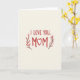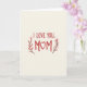 Designed with a soft, creamy off‑white background, this card centers on a warm message that feels close and affectionate ❤️. Near the top, the words “I LOVE YOU” sit in rounded, hand-drawn lettering, colored a rich earthy red. Just below, “MOM” appears larger in the same warm red, giving it extra emphasis without feeling harsh. The “O” in “MOM” is replaced by a small white heart outlined in red, like a gentle hug held in the middle. On both sides of the large word, two leafy branches curve inward, suggesting a caring embrace and a quiet closeness between giver and receiver 🌼. The leaves shift from soft rose pink to deeper terracotta tones, with warm brown stems that keep the look grounded and calm. The layout stays balanced, with generous open space around the text so the message stands out clearly. Two symmetrical botanical flourishes frame the red lettering, with the heart-shaped “O” centered between them.