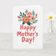 Designed with a modern floral illustration, this Mother’s Day card centers on a bouquet shaped like a crown near the top, as if it’s gently resting above the message with affectionate care ❤️. The flowers mix warm coral, soft blush pink, and sunny marigold tones, balanced by deep teal accents and leafy greens that frame the blooms closely. The petals are drawn with crisp outlines and flat areas of color, giving the arrangement a tidy, graphic look without extra texture. Beneath the bouquet, the words “Happy Mother’s Day!” sit in the lower half, set in a rounded sans-serif style that feels friendly and welcoming. The text appears in a red-orange color that echoes the warm hues in the flowers and draws the eye downward in a smooth flow. A bright white background keeps everything airy, making the colors stand out and giving the design lots of breathing room 🌼. The overall layout feels like a gentle celebration, with the bouquet hovering above the greeting like a caring gesture from one person to another. The floral crown sits at the upper portion of the card, while the red-orange greeting is centered below it against the white space.