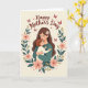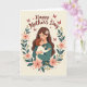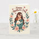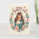 This card shows an adult woman with flowing chestnut hair, a small white flower tucked near her temple, holding a young child close in a snug embrace that feels tender and trusting ❤️. Her eyes are softly closed as she leans in, and the child with reddish-brown hair presses in gently, cheek to shoulder, like they’re sharing a quiet moment together. Around them, an ornate wreath of deep green leaves curls in a circle, dotted with blush-pink blossoms and small golden berry clusters that add warmth. The creamy background keeps the focus on their closeness, while subtle shading gives their hair and clothing a soft, cozy depth. Above the wreath, the message “Happy Mother’s Day” arches across the top in a flowing, dark rose-red lettering that stands out without feeling harsh. Tiny butterflies in crimson drift near the upper corners, and a few little hearts float around the lettering, adding a sweet, affectionate touch 🌼. The wreath’s pink flowers and gold berries are spaced evenly, with the brightest accents near the lower sides of the circle.