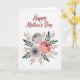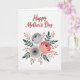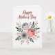 This card features a graceful arrangement of text and flowers on a white background, with a gentle, affectionate mood that feels like a warm hug ❤️. Near the top, the words “Happy Mother’s Day” appear in flowing crimson lettering, centered and easy to spot. Below the message, three stylized blossoms sit together like close companions, suggesting a tender bond through their calm, gathered spacing. One flower is soft coral, while the other two are warm gray and muted taupe, each with a dark center that draws the eye. Around them, deep green leaves fan outward, mixed with thin rust-colored sprigs and small pale yellow-green berry clusters for a quiet, friendly touch 🌼. A fine dotted border runs around the edge in a subtle pink-beige tone, gently framing the design. The petals have muted tones with dark centers, and the border dots form an even line along all four sides.