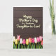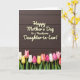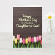 This greeting card features a deep, dark wooden backdrop with visible plank lines and grain that sets a cozy, intimate tone. Across the upper two-thirds, a flowing message in warm yellow lettering sits centered and slightly raised, as if softly lifted from the surface. The gentle glow of the letters feels like a quiet note passed between close friends, with a touch of romance in its warmth ❤️. Along the bottom third, a wide band of spring tulips stretches from edge to edge, arranged like a shared bouquet laid out with care. The blossoms mix creamy white, sunny yellow, tender pink, and warm coral tones, creating a soft, affectionate contrast against the dark wood. Lush green stems and broad leaves weave between the flowers, adding fullness and a grounded, natural calm 🌼. Light falls evenly across the scene, catching the petal edges and the subtle shadows around the raised yellow text. The tulips form a neat horizontal row along the lower edge, with alternating colors and layered leaves overlapping the stems.