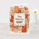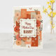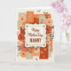 This greeting card features a cream-colored plaque centered on the front, edged with a dotted border and small gold-like flourishes that give it a gentle, classic look. Across the upper portion of the plaque, the words “Happy Mother’s Day” appear in a flowing, cursive-style font in a dark tone, with “NANNY” set beneath in larger, sturdy serif letters for emphasis. Surrounding the plaque is a lush ring of stylized flowers, where large roses shift from blush to coral to deep crimson, their layered petals leaning toward the message like a caring embrace ❤️. Smaller sprigs with red berries and warm golden accents tuck between the blooms, adding little sparks of detail that feel like affectionate gestures. Behind everything, overlapping rectangular panels form a collage in terracotta, muted beige, warm orange, and deep russet, creating a cozy, autumn-like setting. Some of these panels include fine line patterns like floral silhouettes and starburst shapes, while tiny red hearts are scattered around as quiet signs of closeness 🌼. The lighting stays soft and even, and the plaque sits neatly centered amid the roses, berries, and patterned panels.