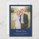 These wedding thank you cards feature a modern, minimalist design with a navy blue background that frames a warm, golden-hour photo of two individuals in a field. The layout is divided into two sections, with the top showcasing the photograph and the bottom displaying elegant script and serif typography for a heartfelt "Thank You" message. The clean lines and balanced composition create an inviting atmosphere, perfect for expressing gratitude after your special day. The sophisticated style blends classic elegance with contemporary simplicity, making these cards ideal for any wedding celebration.