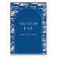 This elegant wedding tabletop sign features a rectangular layout with an arched top, set against a deep blue background adorned with intricate white pastoral illustrations. The design showcases a sophisticated navy central panel with the words "DESSERT BAR" in a classic serif font, inviting guests to indulge with "PLEASE TAKE A TREAT!" in a friendly sans-serif style. The combination of traditional tapestry-inspired motifs and modern typography creates a warm, welcoming atmosphere perfect for celebrating special moments.