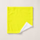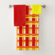 This towel set has a yellow washcloth, a red hand towel, and a bath towel with an Art Deco design of a plaid with thick and thin lines in red, orange, and yellow.