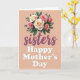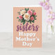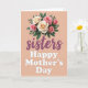 This greeting card features a soft peach background with a lush bouquet of roses centered near the top, mixing creamy white blooms with gentle pink petals and one deeper pink bud nestled among rich green leaves. The flowers feel like they’re leaning toward each other, creating a quiet closeness that reads like sisterly affection ❤️. Below the bouquet, the word “sisters” sits prominently in a flowing plum-colored cursive style, with a tiny heart used as the dot over the “i.” Under that, “Happy Mother’s Day” appears in rounded white letters, centered and spaced to feel steady and welcoming. A faint raised effect on the white lettering gives it a lightly textured look without distracting from the florals. The whole layout is framed by a subtle double-line border in a slightly darker peach tone, keeping the design neatly contained. Soft, diffused lighting makes the petals look gently shaded, as if they’re catching morning light 🌼. The border lines sit close to the edges, and the bouquet’s stems and leaves taper downward toward the centered text.