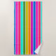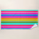 This beach towel has a design of spring stripes in pink, yellow, orange, green, blue, and purple.