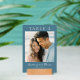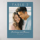 This wedding table card features a modern yet classic design with a soft teal background that complements the central photo placeholder. The layout is balanced and elegant, showcasing a large "TABLE 2" in uppercase serif font at the top, while customizable names are elegantly scripted below the image. The clean typography and minimalistic color palette create a warm and inviting atmosphere, perfect for formal gatherings or weddings. Its straightforward representation style emphasizes clarity and sophistication, making it an ideal choice for couples looking to add a personal touch to their special day.