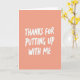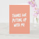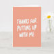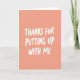 Designed with a soft coral-peach background, this card keeps the scene simple while still feeling close and affectionate ❤️. Centered in the vertical layout, the message “THANKS FOR PUTTING UP WITH ME” takes up most of the space, like someone saying it with a sheepish smile and a fond glance. The letters are white and slightly uneven, as if written with a paint pen, which makes it feel more like a real note between friends or partners than something overly formal. Generous open space surrounds the wording, giving the message room to breathe and making it easy to read at a glance. The warm backdrop and crisp white text create a gentle contrast that feels calm and welcoming, like a quiet moment shared over coffee. The phrase sits in the middle rather than at the top or bottom, keeping your eyes focused on the words and the implied tenderness behind them 🌼. The overall look is minimal, with no extra illustrations, borders, or patterns—just color, space, and the central message in white lettering. The background is a smooth, solid coral-peach field with the white text standing alone in the center.