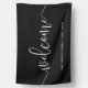 A great gift for newlyweds or new homeowners, our personalized welcome house flag features "welcome" in white handwritten calligraphy script on a rich black background. Personalize with your family name and year established in classic block lettering.