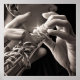 This extremely detailed hyperrealist oil painting by Jeff Bartels depicts a man playing the flute. The closely cropped, black and white image features the flutist's fingers on the flute with his face in the background. Strong light and shadows along with the tight cropping gives this painting a striking and dramatic feel.