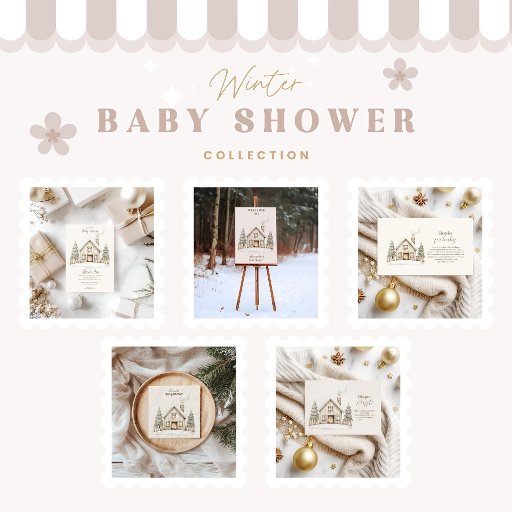 Celebrate the arrival of a little one with this cozy winter baby shower design. A charming hand-painted cottage with a glowing fireplace sits nestled between snow-covered pines, creating a peaceful woodland setting. The soft taupe tones and minimal Nordic aesthetic bring warmth and rustic elegance to your seasonal celebration.