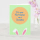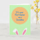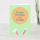 This greeting card features a large peach-orange circle near the top center, set against a light spring-green background that feels like a fresh April morning 🌷. Inside the circle, a short milestone message appears in medium-blue lettering with a casual hand-drawn look, centered and easy to read. The warm circle and cool blue text create a gentle contrast, like two close friends balancing each other in a quiet, happy moment. From the bottom edge, two tall bunny ears peek up, hinting at a sweet, affectionate presence just out of view 🐰. Each ear is outlined in white and filled with soft pink, with smooth curves that suggest a shy little greeting. The layout stays simple with wide areas of color and tidy edges, keeping the focus on the message and the friendly character details. The bunny ears sit low along the bottom border while the peach-orange circle and blue text remain the main focal point above.