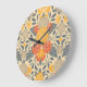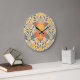This wall clock features flowers and leaves in shades of yellow, orange, and blue-gray on a cream-colored background.
