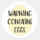 Allergen Warning, Contains Egg food allergy alert stickers. Label foods with a egg ingredient warning. Great for bake sales, pot lucks and around the house to put on snacks or baked goods. Yellow egg in center of text stating WARNING CONTAINS EGGS. Designs by Lil Allergy Advocates www.lilallergyadvocates.com