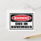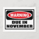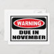 Warning DUE IN NOVEMBER Postcard you can customize at www.WarningSignShirts.com and features a red and black warning sign and DUE IN NOVEMBER in bold black letters to warn the world. You can also customize your own warning sign Postcard with the text you want.