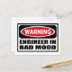 Warning ENGINEER IN BAD MOOD Postcard you can customize at www.WarningSignShirts.com and features a red and black warning sign and ENGINEER IN BAD MOOD in bold black letters to warn the world. You can also customize your own warning sign Postcard with the text you want.