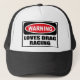 Warning LOVES DRAG RACING Hat you can customize at www.WarningSignShirts.com and features a red and black warning sign and LOVES DRAG RACING in bold black letters to warn the world. You can also customize your own warning sign Hat with the text you want.