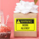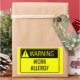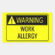 Warning Work Allergy funny warning sign in bright safety yellow and black font lettering with a exclamation warning symbol in a yellow triangle.